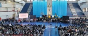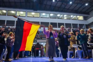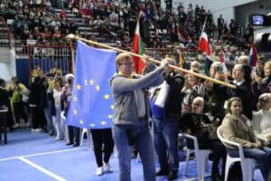Um halb acht am Abend des 10. September startet das Jubiläum offiziell in der großen Sporthalle des Freizeitzentrums ´Clube Recreativo Dores` mit der Eröffnungsfeier des Internationalen Treffens. Obwohl die deutsche Delegation verhältnismäßig klein ist, sind wir beim Einzug der Landesflaggen gleich zweimal vertreten. Je zwei Frauen ziehen mit der deutschen und der Europa Flagge ein. Das ist ein besonderer und auch ein bewegender Moment.