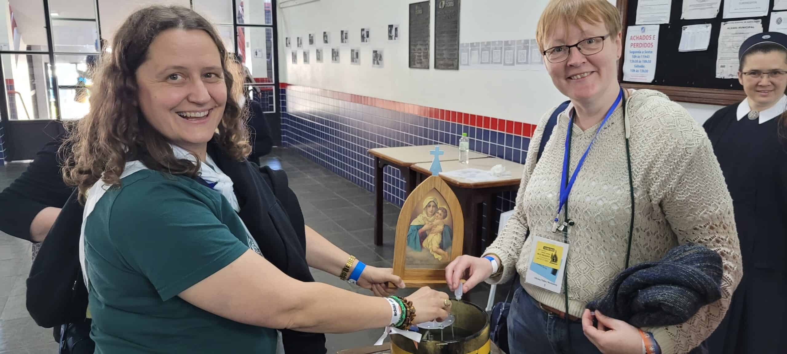 durch seine Initiative die Gottesmutter indie ganze Welt gebracht hat. Auch wir bekommen kleine Fläschen mit dieser Flüssigkeit, die wir nachher beim Verlassen der Halle mit in die Flamme gießen können. Dies soll das Symbol für unseren Anteil, unser Zutun sein, dass die Flamme nicht erlischt; Zeichen dafür, dass in unseren Herzen die Fackel der Hoffnung brennt.